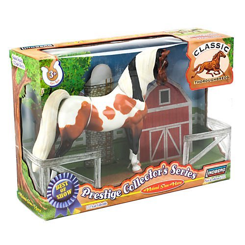 Details: J. Lloyd / Lindberg, Best of Show Prestige Collectors’ Series item, Classic Thoroughbreds. Item no. 76338. National Show Horse model. A cross breed with Saddle Breds and Arabians. Rear box discusses this breed, with lots of information pertaining to its origin / behavior. Our horse is contained within a box with viewable plastic front. Behind our horse is a nice mock-up of a tree, silo and barn. Our Show Horse is pinto in color.