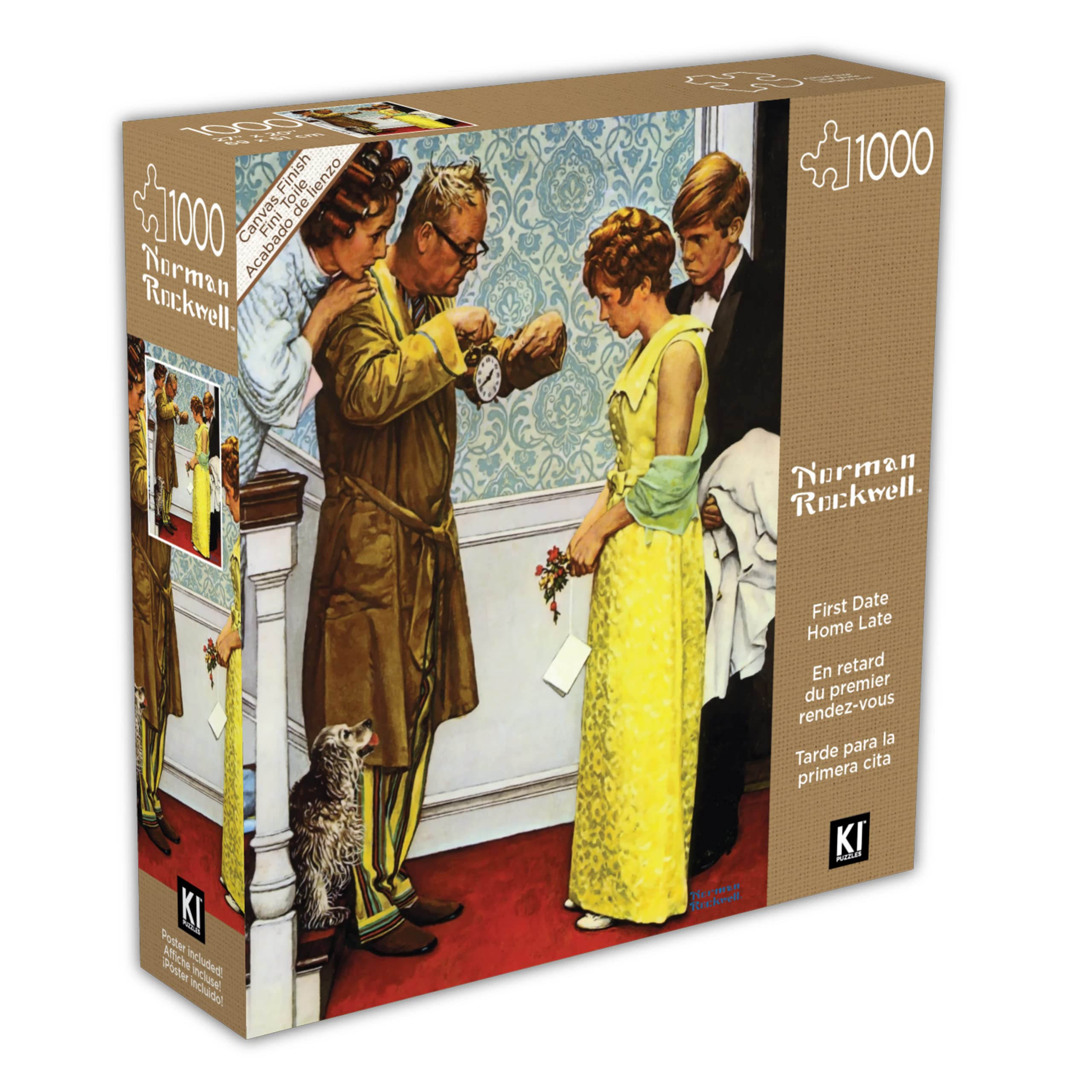 Details: First Date, Home Late by Norman Rockwell, 1000 piece Jigsaw Puzzle for adults. Includes a 1000 piece quality recycled paperboard jigsaw puzzle featuring a colorful image of young couple returning late from the dance being confronted by her irate parents in this funny and charming scene from famous American artist Norman Rockwell. The interlocking jigsaw puzzle is printed on linen weave paper using vegetable based inks. It is made from quality, thick recycled paper board, is sealed in a plastic bag, and includes a large poster image guide.About the Artist: Born in New York City in 1894, Norman Rockwell always wanted to be an artist. At age 14, Rockwell enrolled in art classes at The New York School of Art (formerly The Chase School of Art). Two years later, in 1910, he left high school to study art at The National Academy of Design. He soon transferred to The Art Students League, where he studied with Thomas Fogarty and George Bridgman. Fogarty’s instruction in illustration prepared Rockwell for his first commercial commissions. From Bridgman, Rockwell learned the technical skills on which he relied throughout his long career. Rockwell found success early. He painted his first commission of four Christmas cards before his sixteenth birthday. While still in his teens, he was hired as art director of Boys’ Life, the official publication of the Boy Scouts of America, and began a successful freelance career illustrating a variety of young people’s publications. At age 21, Rockwell’s family moved to New Rochelle, New York, a community whose residents included such famous illustrators as J.C. and Frank Leyendecker and Howard Chandler Christy. There, Rockwell set up a studio with the cartoonist Clyde Forsythe and produced work for such magazines as Life, Literary Digest, and Country Gentleman. In 1916, the 22-year-old Rockwell painted his first cover for The Saturday Evening Post, the magazine considered by Rockwell to be the “greatest show window in America.” Over the next 47 years, another 321 Rockwell covers would appear on the cover of the Post. Also in 1916, Rockwell married Irene O’Connor; they divorced in 1930. The 1930s and 1940s are generally considered to be the most fruitful decades of Rockwell’s career. In 1930 he married Mary Barstow, a schoolteacher, and the couple had three sons, Jarvis, Thomas, and Peter. The family moved to Arlington, Vermont, in 1939, and Rockwell’s work began to reflect small-town American life. In 1943, inspired by President Franklin Roosevelt’s address to Congress, Rockwell painted the Four Freedoms paintings. They were reproduced in four consecutive issues of The Saturday Evening Post with essays by contemporary writers. Rockwell’s interpretations ofFreedom of Speech, Freedom to Worship, Freedom from Want, and Freedom from Fear proved to be enormously popular. The works toured the United States in an exhibition that was jointly sponsored by the Post and the U.S. Treasury Department and, through the sale of war bonds, raised more than 130 million for the war effort. Although the Four Freedoms series was a great success, 1943 also brought Rockwell an enormous loss. A fire destroyed his Arlington studio as well as numerous paintings and his collection of historical costumes and props. In 1953, the Rockwell family moved from Arlington, Vermont, to Stockbridge, Massachusetts. Six years later, Mary Barstow Rockwell died unexpectedly. In collaboration with his son Thomas, Rockwell published his autobiography, My Adventures as an Illustrator, in 1960. The Saturday Evening Post carried excerpts from the best-selling book in eight consecutive issues, with Rockwell’s Triple Self-Portrait on the cover of the first. In 1961, Rockwell married Molly Punderson, a retired teacher. Two years later, he ended his 47-year association with The Saturday Evening Post and began to work for Look magazine. During his 10-year association with Look, Rockwell painted pictures illustrating some of his deepest concerns and inte