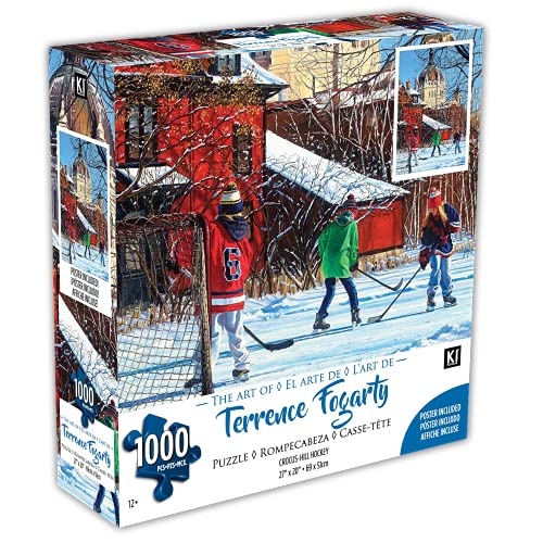 Details: Terrence Fogarty On the Rocks Pond Hockey Jigsaw Puzzle for adults. A jigsaw puzzle featuring colorful, detailed image of kids playing winter frozen pond hockey / youth sports. Each piece of art from Terrence Fogarty features a time in the past where lives were simpler and playing a round of hockey with your friends was the only way to spend your snowy day. This interlocking jigsaw puzzle is made of quality, thick recycled paperboard and is 27x20” finished. Designed for family fun (ages 11 and up!). A poster guide sheet for each image is included for easy reference. The puzzle is sealed in a bag with low puzzle dust and ready for gifting or piecing yourself or with friends and family. Relax, kick back and enjoy mentally traveling back in time to your winter pond hockey days while you assemble this challenging puzzle! Look for additional images from Terrence Fogarty and KI Puzzles in more piece counts and styles. About the artist: Summer ripens in a dust of light beneath Terrence Fogarty’s paint brush. Autumn comes alive with points of fire and color for an artist who turns dabs of oil paint into highly realistic artwork. His unique ability to connect with our emotional attachment to sports is a hallmark of his work. Meticulous research and attention to detail is the foundation of his art. Even before sketching his compositions, Fogarty will head out with a camera looking for the exact setting he envisions and will also utilize live models, staging scenes and recording the details for future reference. Fogarty prefers oil paint, because the medium produces rich, vibrant colors and the opportunity to work with paint that stays wet for a long time. Terrence grew up on the east side of St. Paul, Minnesota where memories of attending events with his father inspired his love of sports. After graduating from High School, he focused on art at Southwest Minnesota State University under the guidance of highly respected artist Edward Evans. Amateur and youth sports has always been, and continues to be, a favorite subject of Fogarty. Terrence lives with his wife Karen, daughter Elizabeth and the family dachshund ‘Georgia’ in Victoria, Minnesota.