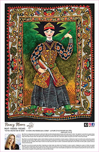 Details: Brilliantly colored 300 piece jigsaw puzzle for adults of a woman in a colorful dress holding a pen while her short sword remains tucked into her belt. "Mighty: The Pen is Mightier than the Sword " by well known female artist Nancy Moore in her Pioneer Women Collection. The interlocking jigsaw puzzle is made from quality, thick recycled paper board and 24x18” when completed. It is packed in a sealed plastic bag with very low puzzle dust. A full color poster sheet for each image is included for easy reference as you relax, kick back and enjoy yourself while you assemble this highly detailed and colorful puzzle! About the artist: Nancy Moore is an award-winning artist devoted to exploring the fragile yet resilient relationship between humanity and the wider world. She is especially interested in the theme of transformation and shape-shifting; the ways in which all living things continuously evolve, morph, regress, and adapt, along with the transformation of different materials into narrative images.The artist’s “color epiphany” occurred when she opened a deluxe 96-pack of Crayolas in 1998. The scent and feel of those crayons transported her to the childhood playroom where she spent hours drawing, and this ignited her artistic career as an adult. Her first image, a chameleon titled “Self-Portrait,” was the first to sell at her first exhibition, and she has never looked back. To create her images, Moore draws the barest outline, then applies layers of watercolor, and sometimes adds crayon, colored pencil, graphite, and gouache, until a fabric of woven texture emerges. Moore’s work has garnered a broad collector base from Vermont to California. She has exhibited widely in museums, galleries, and public institutions, including: Yale University (a yearlong solo show at the Peabody Museum’s Environmental Arts Center), Susan Eley Fine Arts (New York City), Katonah Museum of Art (Katonah NY), New Britain Museum of American Art (New Britain NY), Mattatuck Museum (Waterbury CT), Silvermine Gallery (New Canaan NY), Cultural Alliance of Western Connecticut (Danbury CT), and Westport Arts Center (Westport CT). In 2014, Moore was inducted into the National Association of Women Artists. She is an artist guild member of the Silvermine Arts Center (New Canaan CT), Ridgefield Guild of Artists (Ridgefield CT), Katonah Museum Artists Association, and the Artists Collective of Westport (Westport CT).