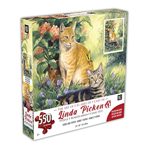 Details: Linda Picken "Self Serve With Cows" 550 piece jigsaw puzzle from KI Puzzles. A detailed, charming fall image of a curious cow checking out the farmer's flower laden wagon. This interlocking jigsaw puzzle made of quality, thick recycled paperboard and is 24x18” when completed. A full color poster sheet for each image is included for easy reference as you relax, kick back and enjoy smiling at Linda’s portrayal of charming animal antics while you assemble this colorful puzzle. About the Artist: Linda lives in the heart of the Ozarks on 14 acres with a large herd of deer, raccoon, fox, coyotes, ducks, and geese. She has always loved animals and has made a career of painting them by traveling to art shows across the country for over 30 years with her husband Neal. Her original oil paintings and limited-edition prints have helped raise money for conservation organizations such as Ducks Unlimited, Quail Unlimited, Pheasants Forever, and the National Elk Foundation. The US Air Force Association honored her by choosing her painting "Majesty" (featuring an eagle) for their anniversary print. Linda has a wide range of work from serious to humorous. Many times she tries to show the interaction of species that would be hard to catch with a camera, like a buck scaring up a pheasant, or dogs on point with the birds portrayed. Her favorite subjects have always been dogs and cats, and she is currently director of Fabulous Felines NWA, Inc. (a non-profit cat rescue foundation). Linda has retired from traveling to shows and is currently licensing her work on products worldwide.
