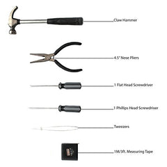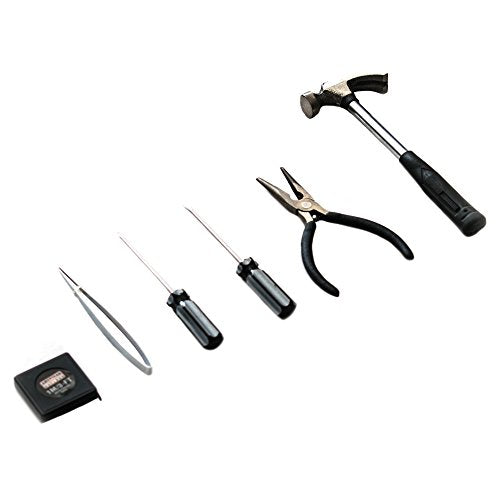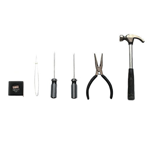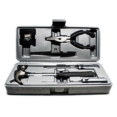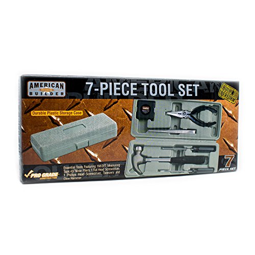 Details: As the maker of some of the finest tools in the world, American Builder has a proud reputation for quality and durability. Utilizing the strongest alloys available, our tools are ell designed, rigorously tested and built to last. Whether you're a do-it-yourselfer or a skillful professional, discover why people look to American Builder to help get the job done. This American Builder 7 piece tool set is portable, handy and contains tools that help you get the job done. This set contains the following: 1. 1M/3ft. Measuring tape 2. 4.5" nose pliers 3. 1 Flat head screwdriver 4. 1 Phillips head screwdriver 5. Tweezers 6. Claw hammer 7. Durable plastic storage case.
