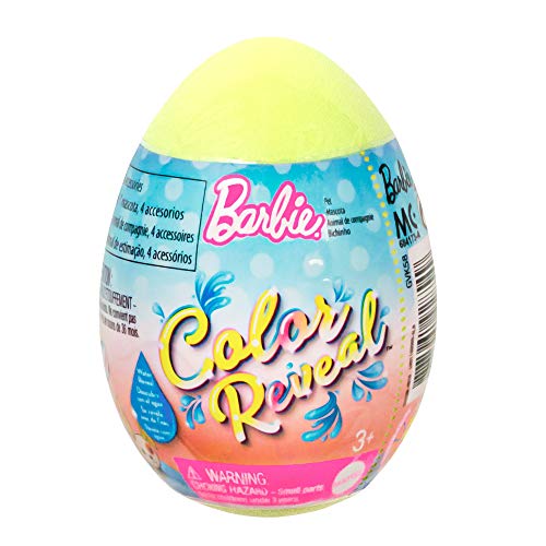Details: Overview Barbie® Color Reveal™ pets deliver an unboxing experience full of surprises -- five of them! The pets come in an Easter egg, with each pet's look a mystery until revealed. Inside the pastel-colored egg are four mystery bags that hide a Color Reveal™ pet figure and three surprise items! Dip the mystery pet covered in Color Reveal™ metallic purple into water. The water turns purple, and when the pet is pulled out, its features are revealed! Each colorful pet is decorated with a bowtie, but the surprises continue…open the rest of the bags to discover a baby chick, a basket and pet ears -- there are more than 20 different combinations of a pet and cute baby animal ears! Color-change effects on the pet's face add to the surprise and fun! Which will you reveal? Kids can collect them to mix and match accessories and expand the possibilities. Each sold separately, subject to availability. Colors and decorations may vary. Product Details Colors, packaging, accessories, and decorations may vary and are subject to change.