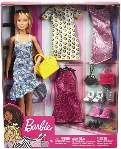 Details: Summary Barbie® doll comes with four complete looks to help tell stories for any time and any occasion. Four dresses, four pairs of shoes and four purses -- plus a pair of trendy sunglasses -- can be mixed and matched to inspire imaginations. Fabrics are trendy, colors are popular and accessories fun. Subject to availability. Colors, packaging, accessories and decorations may vary. Product Details Series: Barbie Age Group: 3+ years Dimensions: 2.25 x 10 x 12.75 Country of Origin: Indonesia