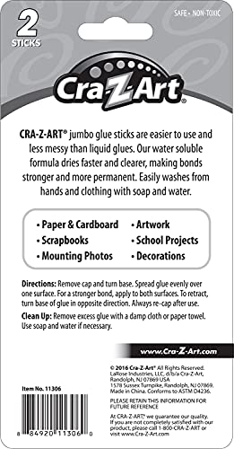 Details: Cra-Z-Art Jumbo glue sticks are great for BIG projects! These glue sticks are washable and non toxic. School quality and acid free for worry-free use. Cra-Z-Art glue sticks dry fast, clear and strong so they are the choice for any school or home project!