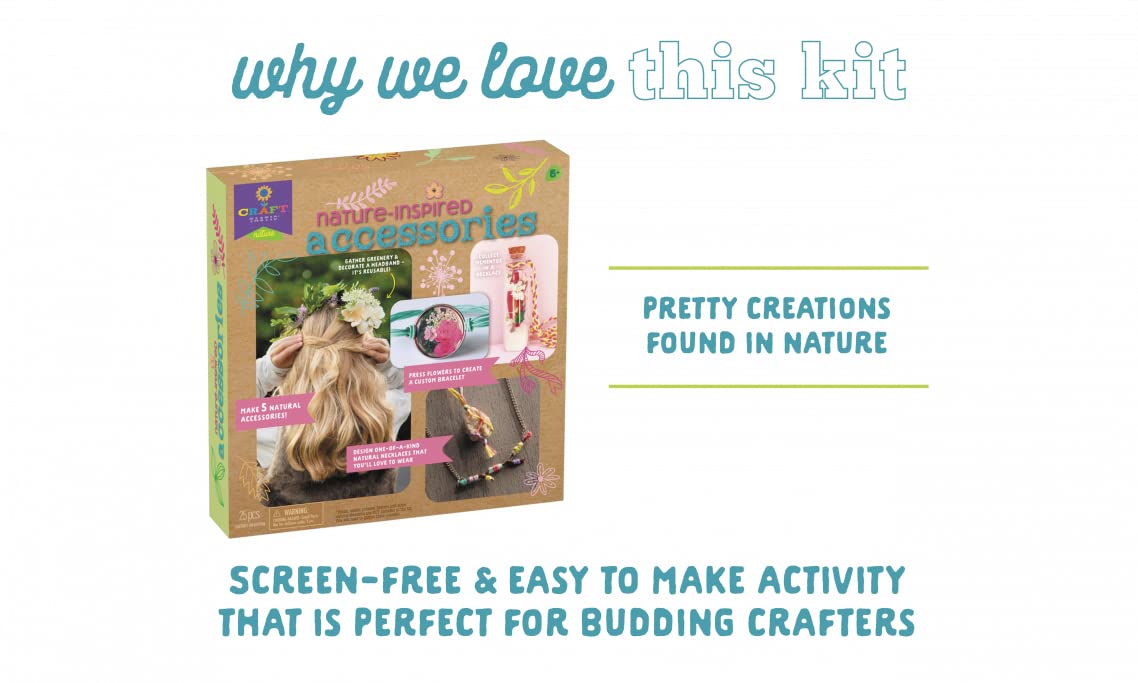 Details: Experience the beauty of nature with Nature-Inspired Accessories! Gather beautiful natural ingredients from outside, then use them to create five different nature accessories—a headband, stick necklace, pressed flower bracelet, macrame necklace, and nature jar necklace. Items like the headband and nature jar that use materials that can expire are reusable, letting you design and redesign your accessories as many times as you want! Comes with all the tools to take some natural materials and make some adorable accessories!