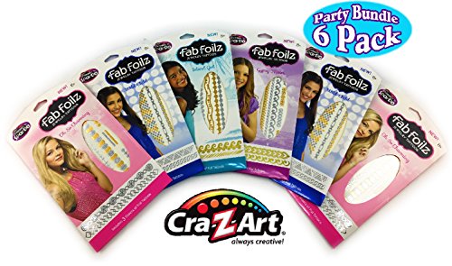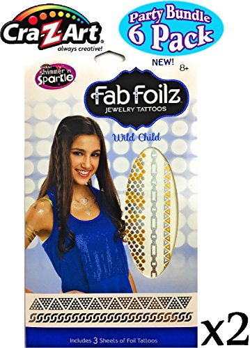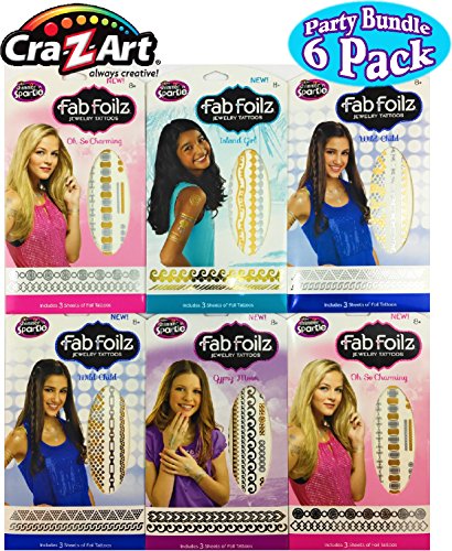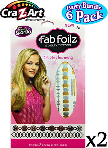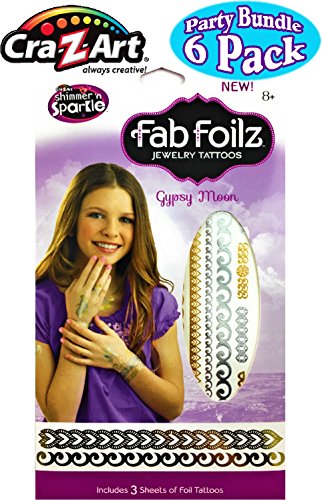 Details: Fab Foilz Tattoos (Temporary) Gift Set Party Bundle - 6 Pack (Over 200 Tattoos), is AWESOME! Create stunning shimmering designs with Shimmer and Sparkle Fab Foilz! Awesome metallic jewelry inspired designs that'll last for days! Set includes 4 different styles of Fab Foilz Tattoos.....Oh So Charming(2), Wild Child(2), Gypsy Moon(1) & Island Girl(1). Includes over 200 Fab Foilz Jewelry Tattoos! Awesome metallic designs that'll last for days! PREMIUM QUALITY Metallic temporary tattoos will last several days and keep its flash & glitter look. Not to mention, they’re waterproof. Makes a great gift & is perfect for party favors, stocking stuffers, baskets, July 4th, summer, beach, promotions and so much more! For Ages 8 and up - Fun for the whole family!
