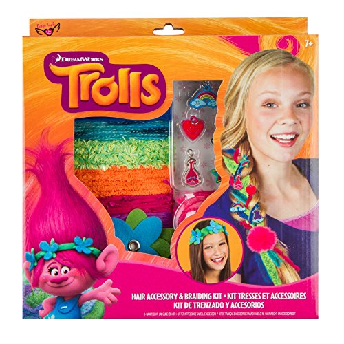 Details: Create unique Trolls inspired hairstyles with the "Express" Hair Accessory Kit by Fashion Angels. Braid your hair with bulky, fuzzy, vibrant and playful yarn! Add trolls epoxy charms and tie with Poof ball elastic. Includes Poppy's headband! Enter a colorful, wondrous world populated by hilariously unforgettable characters and discover the story of the overly optimistic Trolls, with a constant song on their lips! DreamWorks’ Trolls is a fresh, broad comedy filled with music, heart and hair-raising adventures.