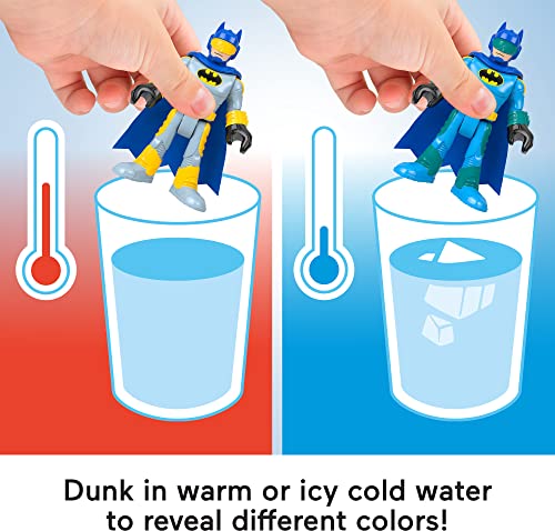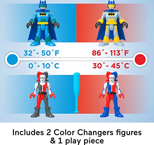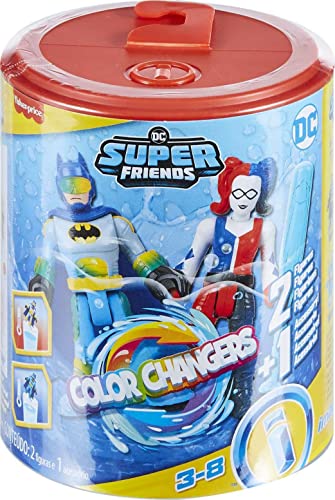 Details: Action-packed Super Hero versus Super-Villain adventures get an exciting new twist with this color-changing Imaginext DC Super Friends Color Changers figure set from Fisher-Price. Fill the included cannister with either warm or icy cold water and drop Batman and Harley Quinn inside to see the figures change color! Kids can collect additional Imaginext DC Super Friends Color Changers figure sets for more exciting pretend play. (Each sold separately and subject to availability.) Colors and decorations may vary.