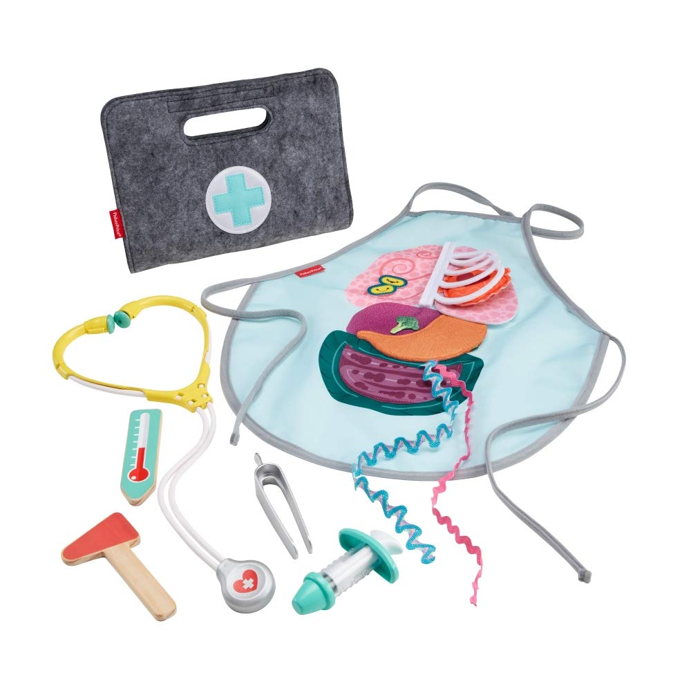 Details: The Fisher-Price Patient and Doctor Set lets kids go from patient to doctor and back again for endless pretend play appointments! The fabric doctor bag is equipped with all the cool tools of the trade, like a pretend syringe, thermometer, and more, featuring smooth wood accents. And the colorful fabric patient apron lets preschoolers explore the insides of the body…and discover fun surprises along the way!