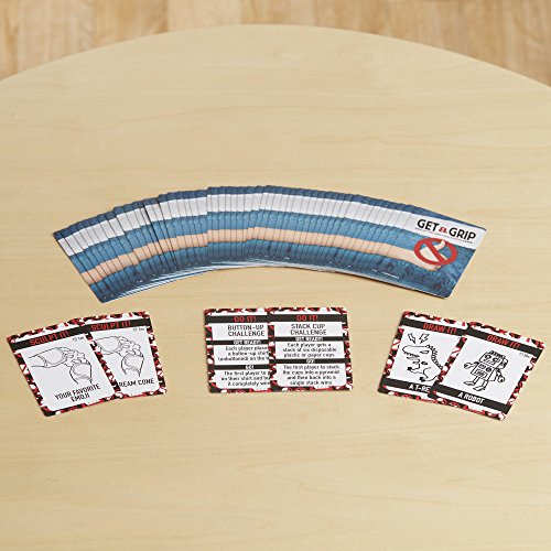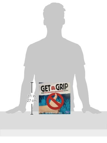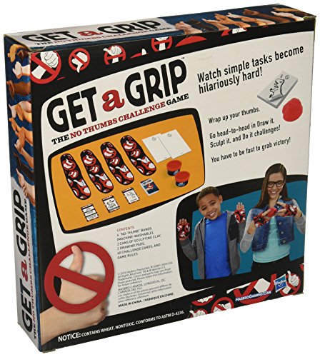 Details: The Get a Grip game is Hasbro's twist on the "no thumbs challenge" in which players compete head-to-head in challenges without using their thumbs! First, players wrap their thumbs (or for greater challenges, tuck in additional fingers) in the included hand bands so that they can't use them. Then a player picks a card that will tell them to Draw it, Sculpt it, or Do it…all without the use of these important body parts. Earn cards by completing challenges. The first person to collect 3 cards wins the game. Hasbro Gaming and all related terms are trademarks of Hasbro.