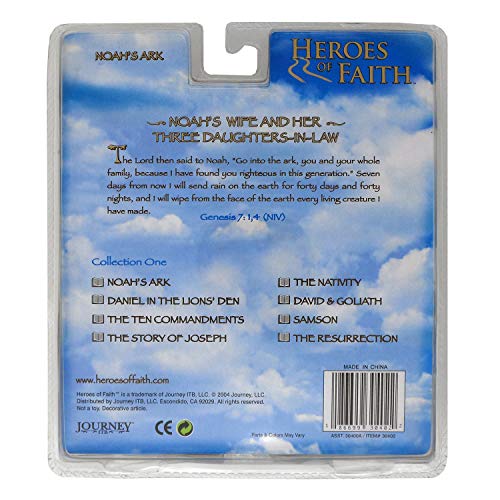 Details: Heroes of Faith Noah's Ark Collection One - Noah's Wife and Her Three Daughters-In-Law. Includes Noah's wife and her three Daughters-in-Law. Also includes the bible verse Genesis 7:1,4 on a scroll.