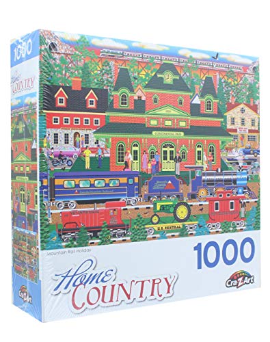 Details: Home Country 1000 piece jigsaw puzzle "Mountain Rail Holiday" features the Americana stylings of Mark Frost. In this puzzle we have a number of steam engine trains both parked in front of a classic train station and on the tracks beyond. Home Country Premium Puzzles represents the highest quality imagery and puzzles available today. These are the brightest, richest, most colorful puzzles we have ever made. Mounted on European puzzle board, you will feel the weight and quality in every piece. Each piece is fully interlocking and has a beautiful "snap" as you assemble the puzzle. Bonus puzzle poster included.