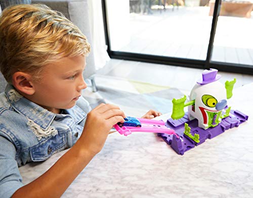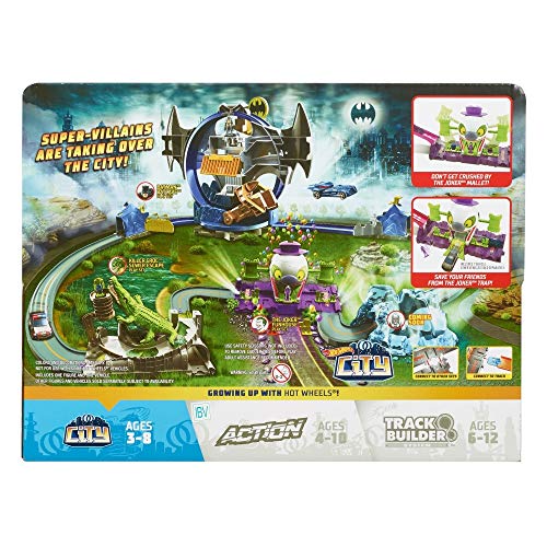 Details: The outskirts of Hot Wheels City have been infiltrated by villains stirring up trouble! The Joker has taken over the amusement park and has re-named it The Joker Funhouse! Drive up the ramp on the side of the Funhouse and be careful to avoid the swinging mallets and free trapped friends and defeat The Joker! Use the elevated ramp and the Batmobile in the Killer Croc Sewer Escape set to slide down the sewer at top speed to get past the enormous crocodile and save the city. Mr. Freeze takes over the Gotham City police department and it's up to kids to launch Batman around the ramp to defeat the villain and free the police in the Police Takeover Play Set. Also included is the Batman Repair Bunker Play Set where kids can go to fuel up and fix the Batmobile. Use the special platform to take the car to the next level and launch into the next adventure! Each set comes with a Batmobile for battling the bad guys and their own mini-figure. Sets connects directly to the Batcave and other Hot Wheels City sets (sold separately) with a brand-new connection system, still compatible with your orange track.