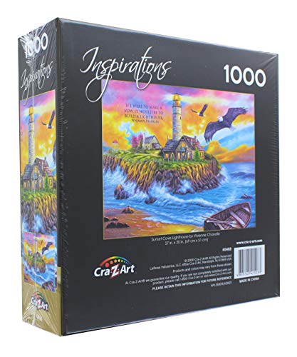 Details: Sunset Cove Lighthouse (Inspirations) a 1000 piece jigsaw puzzle from Lafayette Puzzle Factory featuring a quaint cottage and gleaming lighthouse on a coastal island! Full of rich color and detail, many are sure to love this image! Completed puzzle is 21" x 27" (53.34 x 68.58 cm)