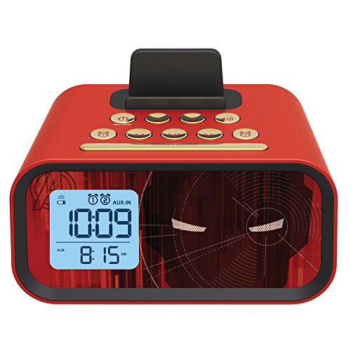Details: The Iron Man Dual Alarm Clock Speaker System has a USB port for charging your smartphone and a convenient stand that supports your smartphone. With a built-in audio cable that plays music from any device with a headphone jack. You can sleep to your music with auto-shutoff and wake to a buzzer with dual alarms. The backlit LCD lets you see time and alarm time clearly.
