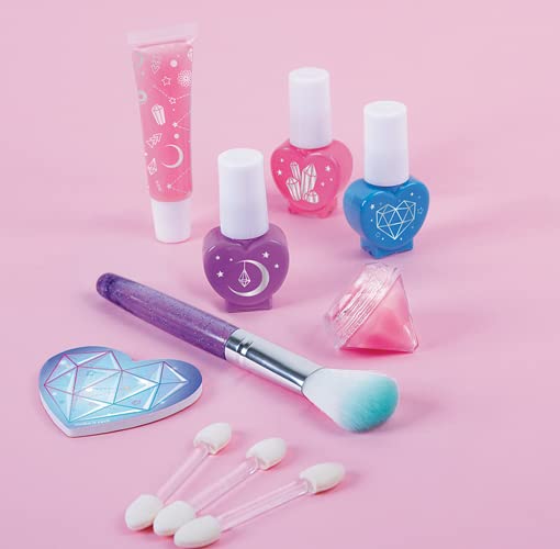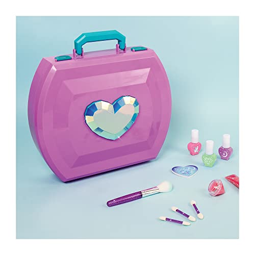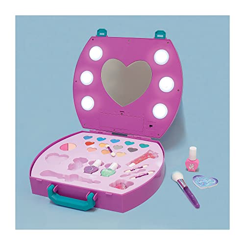 Details: This Light Up Cosmetic Studio is an all-in-one beauty set that features an illuminated mirror and all the fun dress-up cosmetics needed to create bright, picture-perfect manis and matching makeup looks. The set comes packed in a glam heart-shaped case that you can easily carry on the go! Requires 4 AA batteries (not included).