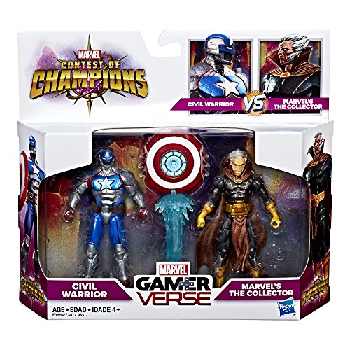 Details: Taneleer TriVac, known as the collector, is a member of the elders of the universe whose primary pursuit is collecting and (sometimes insatiable) hoarding. He tasks players, known as summoners, with collecting heroes and villains such as Civil Warrior, the Captain America of an alternate earth ravaged by Civil War. imagine the action as the heroes and villains of the Marvel universe face off with this Marvel gamerverse Marvel: contest of Champions 3.75 inch 2-Pack of figures, including Marvel the collector and Civil Warrior. copyright 2018 Marvel. Hasbro and all related terms are trademarks of Hasbro.