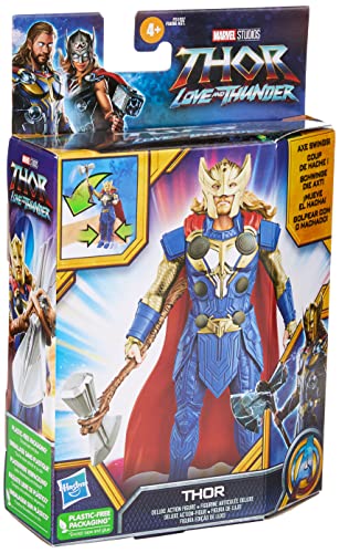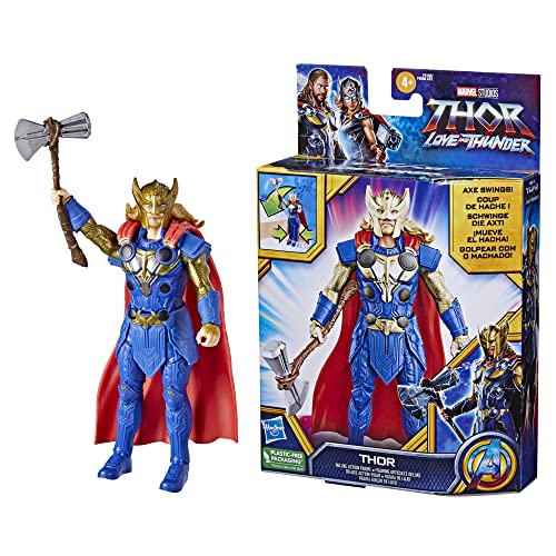 Details: After Thor commits himself to a life of peace, he must return to the battlefield when the threat of a new evil arises! Imagine smashing into otherworldly action and adventure with this 6-inch-scale Thor deluxe action figure from Marvel! Featuring design and detail inspired by Marvel Studios' Thor: Love and Thunder, part of the Marvel Cinematic Universe, kids ages 4 and up can pretend to join the battle to protect New Asgard. Squeeze the Thor deluxe action figure's legs to activate a fun axe-swinging action feature! Boys and girls will love re-creating favorite moments from the Marvel entertainment, as well as imagining their own superpowered adventures. This 6-inch-scale Marvel Studios' Thor: Love and Thunder deluxe action figure is detailed to look like the Thor character from the Marvel Cinematic Universe, featuring entertainment-inspired design and detail, basic articulation, and axe-swinging action. © 2022 MARVEL. Hasbro and all related terms are trademarks of Hasbro.