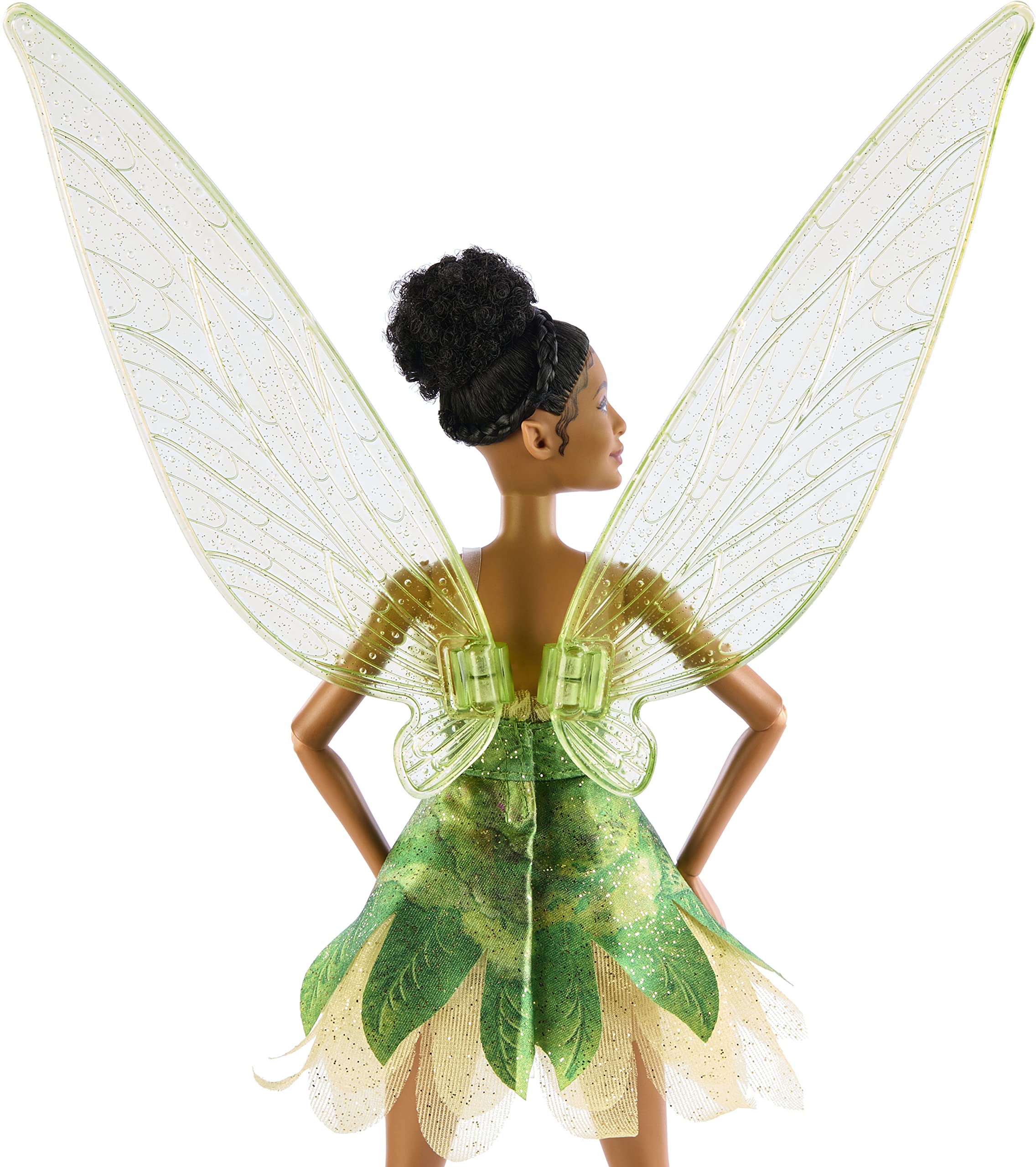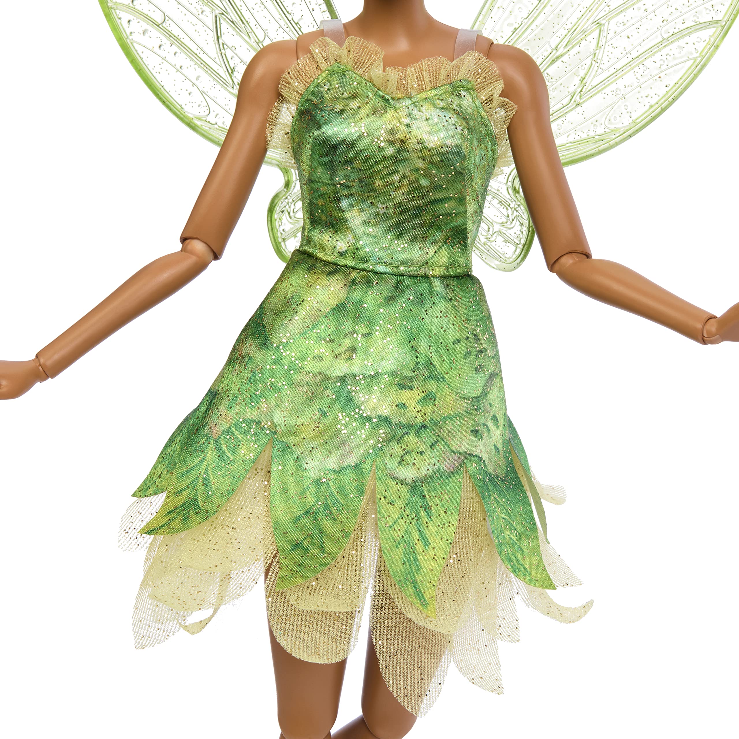 Details: Meet this Tinker Bell doll, inspired by the feisty fairy from Disney's film, Peter Pan & Wendy! This fashion doll is shown in her exciting look, featuring a soft dress in her signature green color, and has poseable, sparkling wings and a fully poseable body. In her outfit from the movie, this Tinker Bell doll is ready for adventures in Never Land! Doll cannot stand alone or fly. Colors and decorations may vary.
