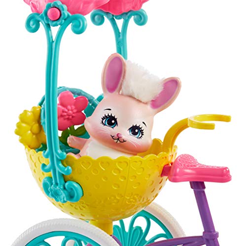Details: Pedal into the world of Enchantimals with Bree Bunny doll and Twist bunny on their colorful, blossoming tricycle! The Enchantimals dolls are lovable characters who share a special bond with their animal friends. Bree Bunny and Twist are always together, and they look alike, too! This tricycle playset includes the six-inch Enchantimals doll, animal friend figure, a tricycle (that's built for two and really rolls), a flower basket, and stemmed flower accessories. The pedal pals can ride together on this charming tricycle blooming with floral details -so perfect for flower-picking fun in the enchanted forest! For storytelling play, fill the basket with the flower accessories and hang it on the tricycle handlebars, or keep it snug in the backseat with Twist bunny. Sit Bree Bunny doll on the bike seat in riding position: snap her waist into the doll holder, then place her shoes onto the pedals and place her hands onto the handlebars (that really attach to doll hands). Tuck Twist bunny right behind her in the yellow basket seat, topped with a beautiful, pink petal-shaped canopy. Simply push to start the fun! Bree Bunny doll wears a colorful, flower-printed dress with cute purple shoes. She has enchanting touches that match Twist bunny, portraying their special bond -like bunny ears, a fluffy tail, and bunny-inspired facial features. Twist bunny is charming with furry touches and tiny pink paws. Kids will love recreating the special bond the friends share and celebrating a world where Caring Is Our Everything. Collect them to build out a world of Enchantimals and tell enchanting stories of your own.