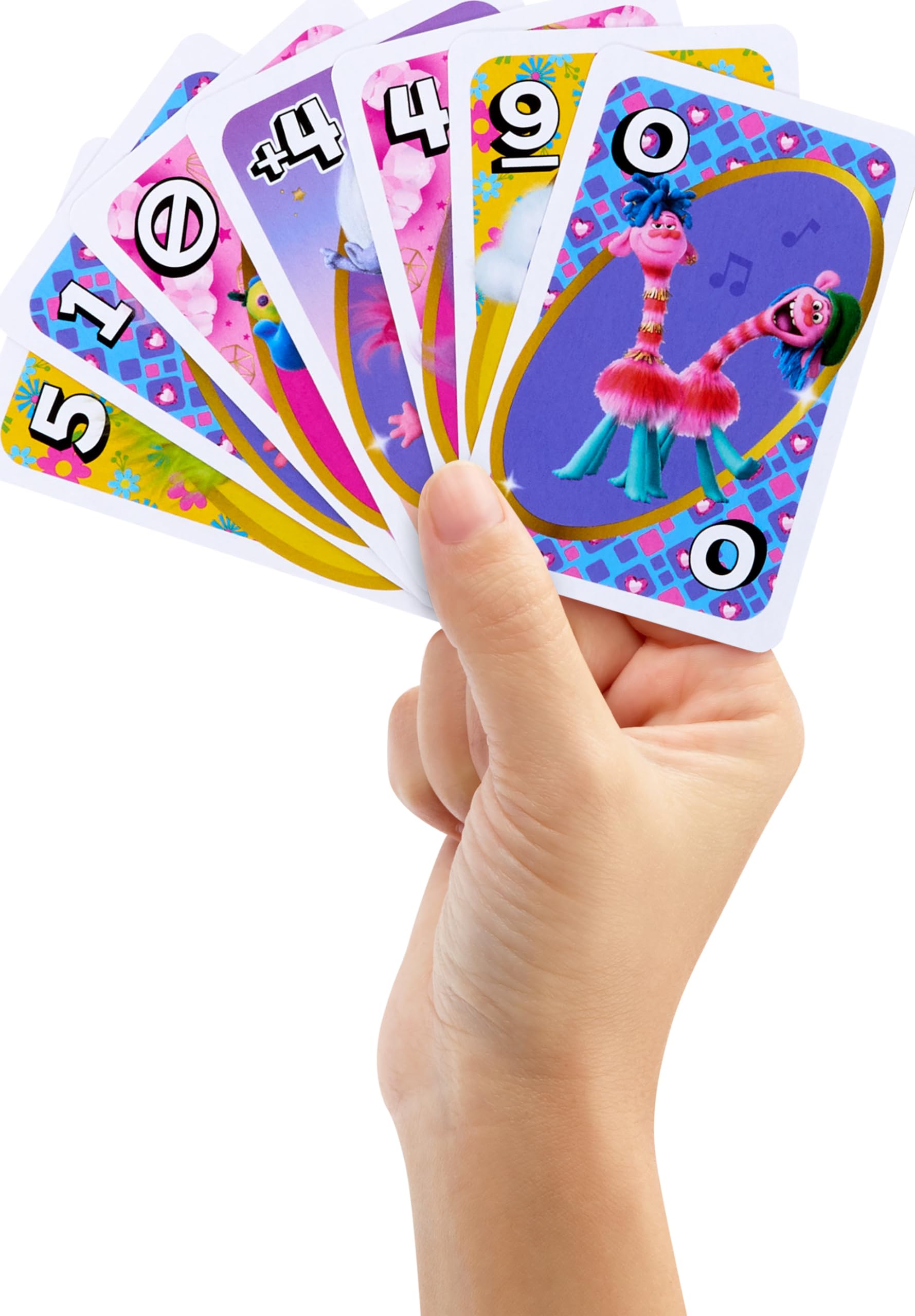 Details: Fans of the Trolls Band Together movie will love playing with this special UNO card game. With a deck featuring graphics inspired by favorite characters and scenes, players try to match colors and numbers -- there's even a special "Power of Togetherness" rule that may have players drawing extra cards! And when down to a last card, don't forget to yell "UNO!" Makes a great gift for fans of the Trolls Band Together movie and card game lovers ages 7 years old and up. Colors and decorations may vary.