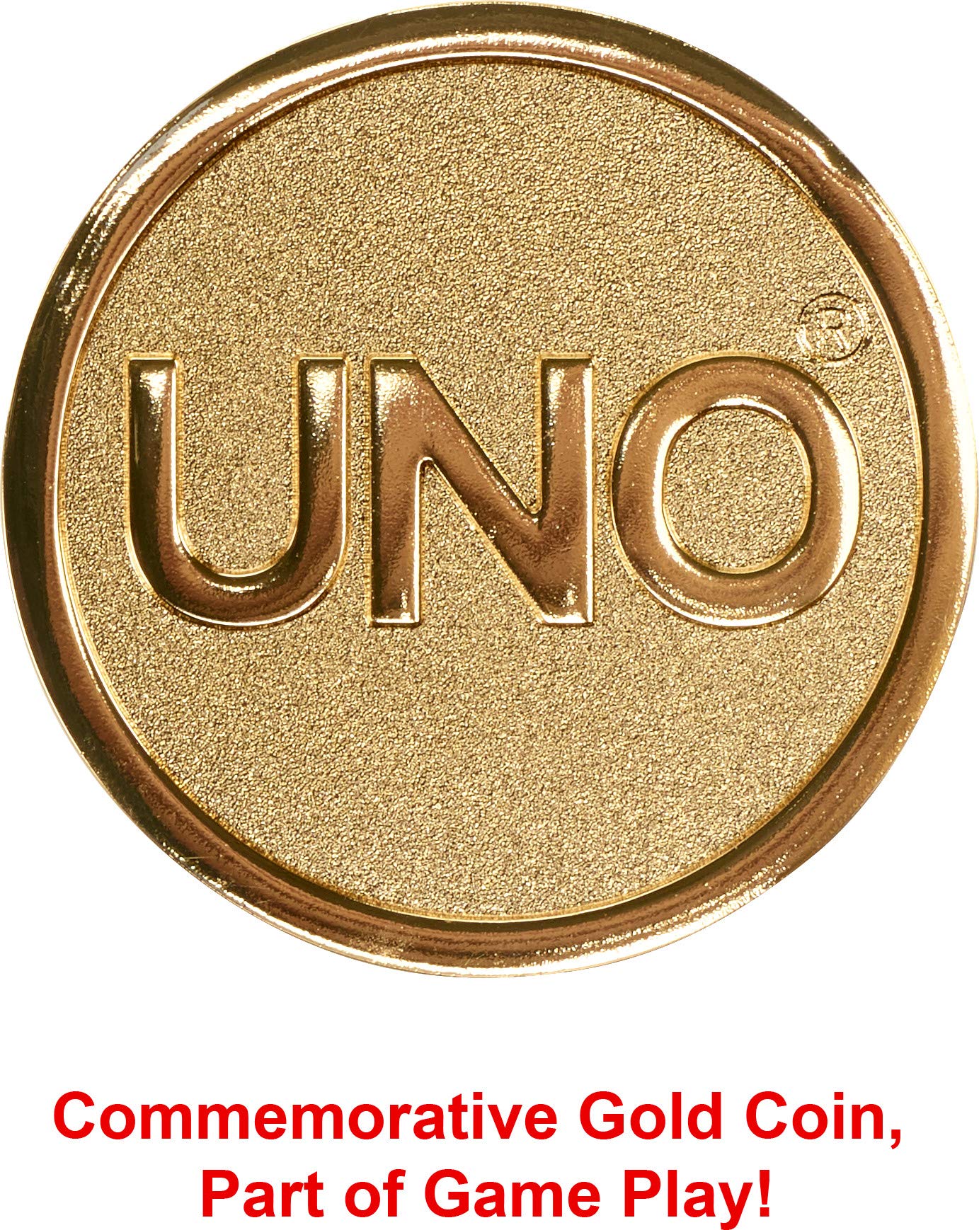 Details: The UNO card game is celebrating 50 years of bringing people together for fast fun and unpredictable twists with this premium Golden Anniversary edition of the classic card game. It arrives in a deluxe, specially designed box and includes cards with a velvety smooth finish. A commemorative golden medallion collector coin is included, and when someone plays the special "50/50" card you flip it to see who will have to draw extra cards! Just like the last 50 years, when a player is down to one card, they must yell "UNO!" Colors and decorations may vary.