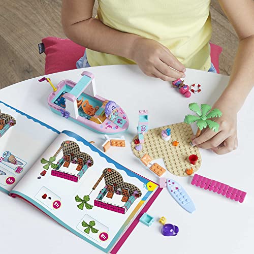Details: MEGA Barbie Color Reveal building toys deliver an unboxing experience that's full of surprises. Each micro-doll's look is a magical mystery waiting to be revealed. Start the reveal experience by opening the container and removing the baseplate to find 2 surprise bags. Inside you'll find 10+ surprise including 2 Color Reveal micro-doll. Fill the container with warm water, place the micro-doll inside and swirl her around to reveal her look. Then, dip the sponge in icy water to transform her appearance. Place the remaining mystery items in the warm water to reveal more surprises. Build the boat with a Color Reveal bottom to discover fish and place both micro-dolls inside to head out for the exploration. Then, build the jumping hoops to teach the dolphins new tricks. When it's time to relax, build the beach hut and have some fun in the sun.