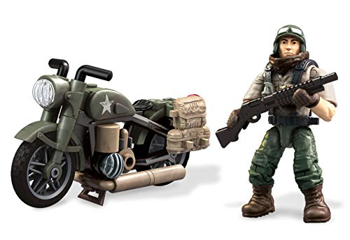 Details: Charge across enemy lines with a classic WWII-era motorcycle! Lead a historic raid into enemy territory when you suit up for duty with an American soldier and a buildable WWII-era military motorcycle! Build your motorbike, complete with rolling rubber wheels and printed detail. Then gear your soldier using the authentic armor and accessories before getting in the driver's seat and charging toward victory!.