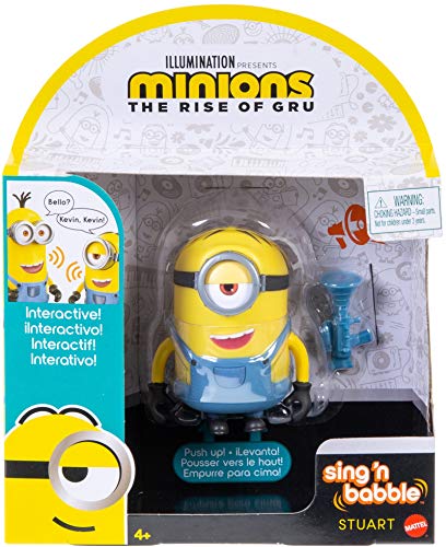 Details: The Minions Sing 'n Babble Stuart figure brings the fun of the Minions movies home! Standing approximately 4 inches (10.2 cm) tall, Stuart interacts with all the other Minion Sing 'n Babble characters! This figure has 25 plus Stuart-specific sounds -chatter, songs and laughter -and comes with a blaster accessory that is swappable with other same-sized Minion figures. Just push down on the figure and see Stuart interact like never before as he talks, sings, and respond to other Minions, calling them by name! Combining multiple Sing 'n Babble figures creates a talking and singing exchange of mischief! Each figure sold separately and subject to availability. Colors, decorations and dimensions may vary.