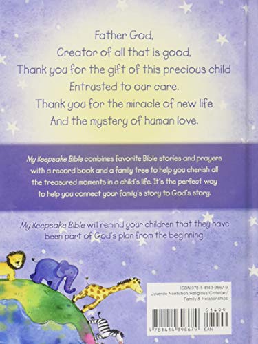 Details: My Keepsake Bible combines baby records, family history, and Bible stories. The padded hardcover book is the perfect gift for a new baby and the ideal way to begin to teach the little one God’s story. Children will learn early that their family’s story is a part of God’s story. Full-color, adorable art complements these stories, prayers, and places to record baby and family info. It’s a memory book and a Bible story book in one.