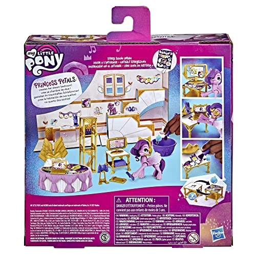 Details: Get to know Princess Pipp Petals: a Pegasus from Zephyr Heights! Princess Petals is a stylish and talented pop star. Her dream bedroom features a colorful surprise with Royal Room Reveal Princess Petals. Inspired by the My Little Pony: A New Generation movie! Includes a 3-inch Princess Petals pink pony figure with a character-inspired music note Cutie Mark on one side. Poseable figure's plastic purple hair is curled in her signature style. Comes with 23 pieces and paper backdrop for setting up the perfect princess bedroom. 3 accessories have a water-reveal surprise! Use the included water bowl and brush to paint water onto the bed and 2 desk accessories. Discover hidden colors and designs that fade after 10 minutes for repeatable fun. Fans new and old can imagine adventures with My Little Pony movie-inspired toys. Makes a great holiday or birthday gift for kids ages 5 years old and up! My Little Pony and all related characters are trademarks of Hasbro.