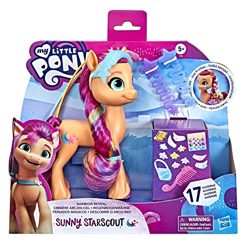Details: Get to know Sunny Starscout: an Earth Pony from Maretime Bay! Sunny is curious, adventurous, and determined to make the world a better place. Imagine discovering a colorful surprise under her signature braid with Rainbow Reveal Sunny Starscout, inspired by the My Little Pony: A New Generation movie. Includes a 15 cm Sunny Starscout orange pony figure with a character-inspired shooting star Cutie Mark on one side. Figure has soft, long pink hair for lots of hair play fun! Included braiding tool can be used to style her hair into a braid, revealing a colorful rainbow pattern as you go. Comes 17 hair and story accessories. Customize Sunny's look with the clips, headband and bracelet, place her movie-inspired journal inside her iconic saddle bag, then decorate everything with stickers! Fans new and old can imagine adventures with My Little Pony: A New Generation toys and gifts for kids ages 5 years old and up.