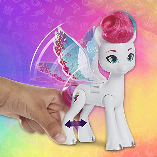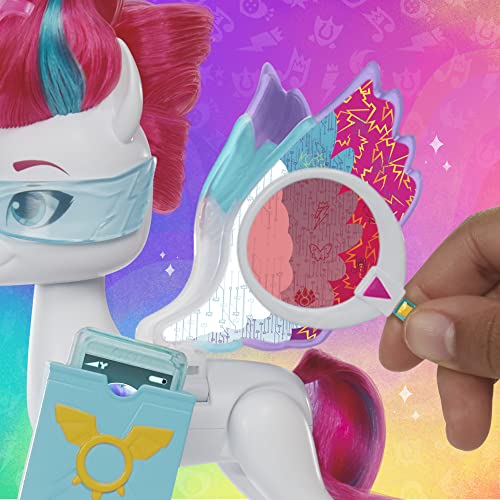 Details: Discover magical secrets with My Little Pony Wing Surprise Zipp Storm toy! Zipp is a rebellious princess who loves investigating mysteries in the My Little Pony: Make Your Mark show. Squeeze the figure's back legs to make her wings flap and reveal surprise colors on one side. Then, hold the magnifying glass decoder accessory over Zipp's wings to discover hidden Cutie Mark designs! Comes with 10 character-inspired accessories for storytelling. Get Zipp ready to solve a magical mystery by putting on her sunglasses and storing her pretend tablet accessory in her wearable satchel. This My Little Pony doll is a 5.5-inch white Pegasus figure with lightning bolt Cutie Mark on one side. Figure has soft, long pink hair and a comb for styling fun! Fans new and old can imagine adventures with My Little Pony movie and show-inspired kids toys. Make great birthday gifts for girls and boys 5 years old and up. My Little Pony and all related characters are trademarks of Hasbro.