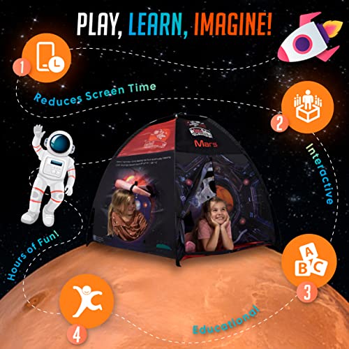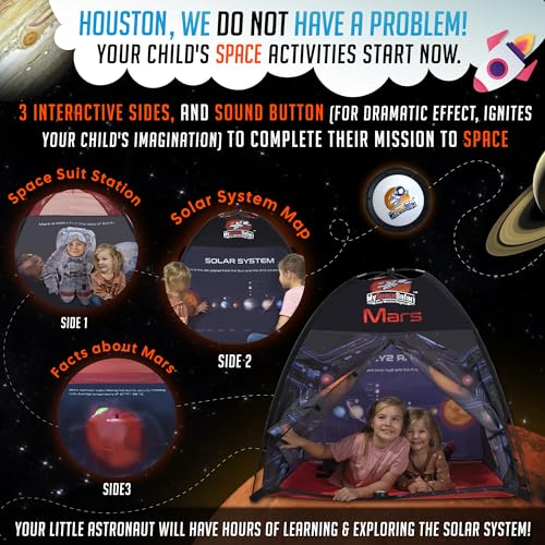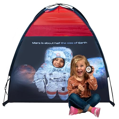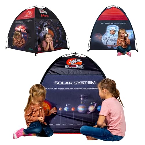 Details: My Space Safari Mars Tents for Kids Indoor & Outdoor: Through the use of images, words, sounds, and other activities, kids can create their space safari. Their mission begins the moment they interact with our kid tents! This indoor or outdoor tent for backyard will take them on a journey that will make a nice memory! With a show of the solar system for learning planets, these kids play tents are not only educational but also engaging and interactive and could foster a passion for outer space. — Features: Our kids outdoor tent sets off a rocket launch with the touch of the sound button, and also allows children to capture a picture with the astronaut’s face cut out. With a length of 46.8” across edges and a height of 42”, these kids tents for boys and girls can be set up in the child’s room for a cool kids space bedroom or outside for some backyard night fun! If your child is fascinated by the mysteries and the beauty of outer space, particularly the planet Mars, our Mars tent for kids outdoor and indoors is sure to be endless joy for him or her! Our kid tent will also make for a cool gift for birthdays or Christmas! --- About Us: We aim to create a fun, interactive, and educational environment where kids can use their imagination to explore and learn about space and the solar system. Our Mars play tent for girls and boys is a step forward in encouraging the love for science in youngsters!