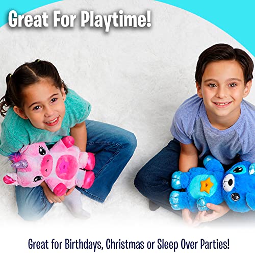 Details: Your little ones will love sleeping and cuddling with their new glowing, plush friend! Star Belly Dream Lites make bedtime fun! The soft, plush design is huggable and perfect for snuggling and cuddling at bedtime and can help comfort kids who are afraid of the dark. Simply press the button on the belly to turn on the night light, and it projects a starry sky onto the ceiling, instantly illuminating your child’s room to help them feel safe and calm. The 2-speed mobile motion mechanism rotates the star lights to help lull your child to sleep. With 6 colors to choose from, your child will have endless fun picking their favorite color!
