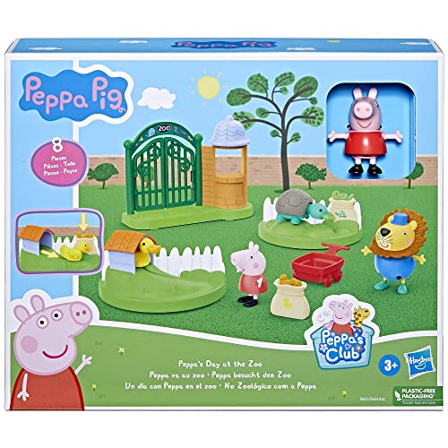 Details: Go on a pretend daytrip with the Peppa's Day at the Zoo playset! This toy for preschoolers comes with 3-inch scale figures of beloved characters inspired by the Peppa Pig TV show -- Peppa herself and Mr. Lion the zookeeper! Pose the figures with the 6 zoo-themed accessories, including a large backdrop of the zoo entrance with gates that open and close! Little ones can place the bags of pretend animal food inside the wagon and imagine they're feeding the little duck and turtle. Place the food bags on the interactive animal stations' hotspots to make the animals move! Preschoolers will love pretending to be on a trip to the zoo or imagining moments from the Peppa Pig show. This playset makes a great Peppa Pig birthday or holiday gift for any preschooler in your life. Build out the world of everyone's favorite four-year-old pig with other Peppa Pig toys for 3 year old girls and boys! (Each sold separately. Subject to availability.) © 2021 ABD Ltd/Ent. One UK Ltd. Hasbro and all related terms are trademarks of Hasbro.