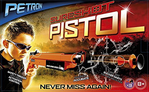 Details: Product Description Established in 1963, Petron sports developed as a family owned archery business serving the UK market. Over the years the product range has continuously expanded to cover the full archery spectrum from entry level toys, through to a wide range of leisure products, and up to top end elite equipment. The Petron Sure shot pistol looks and feels like a real sidearm, but shoots super-safe sucker darts. With a front and rear sight, this pistol is remarkably accurate. The new safety trigger ensures this pistol can only shoot when loaded with a Petron sucker dart. The sure shot Comes with three sure shot sucker darts and a target printed on the back of the box. Additional spare darts are also available from Petron. This item is recommended for ages six years and up. From the Manufacturer Established in 1963, Petron Sports developed as a family owned archery business serving the UK market. Over the years the product range has continuously expanded to cover the full archery spectrum from entry level toys, through to a wide range of leisure products, and up to top end elite equipment. The Petron Sureshot Pistol looks and feels like a real sidearm, but shoots super-safe sucker darts. With a front and rear sight, this pistol is remarkably accurate. The new safety trigger ensures this pistol can only shoot when loaded with a Petron sucker dart. The Sureshot comes with three Sureshot sucker darts and a target printed on the back of the box. Additional spare darts are also available from Petron. This item is recommended for ages six years and up.