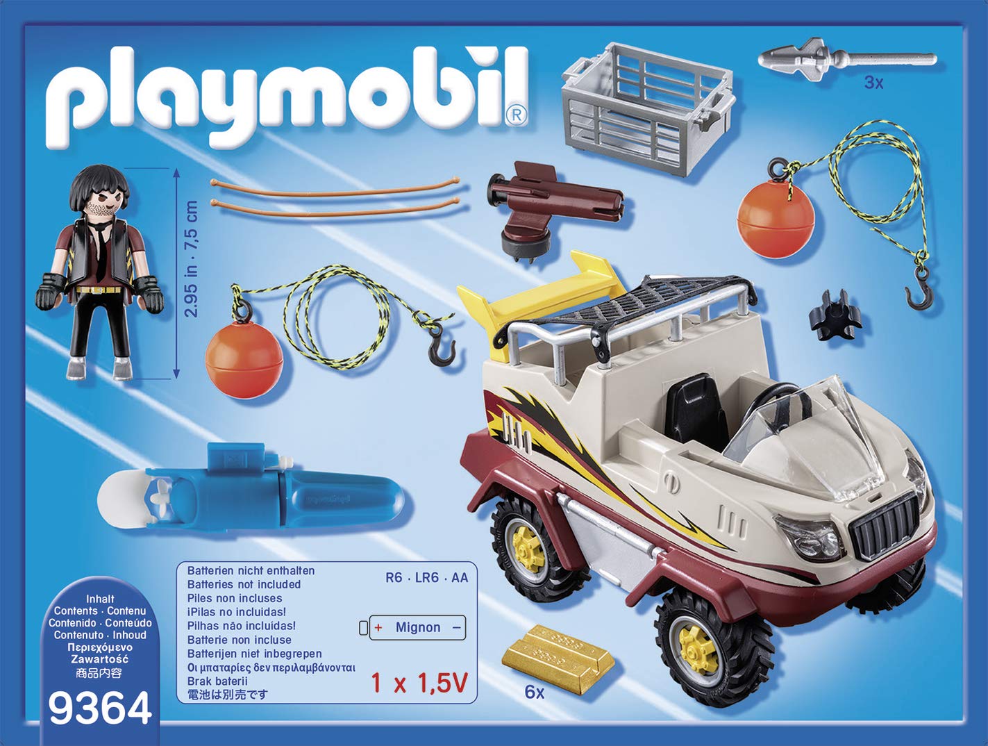 Details: Looks like the Thief is on the run with the amphibious truck! Watch out as he uses the functioning cannon to fend off anyone that approaches. This floating vehicle can easily transition from land to water, and the included underwater motor (1 x AA battery required) will help the Thief attempt a quick escape. Combine this set with the rest of the Playmobil tactical unit police theme (#9360-9365 – sold separately) to fully bring the story to life! Set includes one figure, crate, gold bars, underwater motor, buoys, and other accessories. Dimensions: 7.3 x 3.9 x 4.9 in (LxWxH). recommended for ages five years and up. Warning. Choking HAZARD. Contains a small ball and small parts. Not for children under 3 years.
