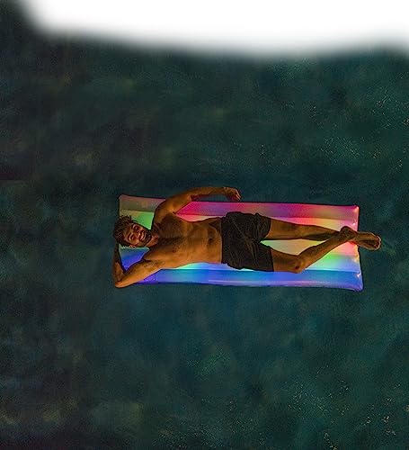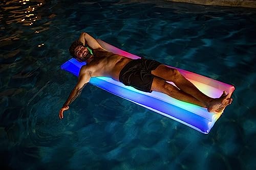 Details: Add bright, beautiful color to your pool - day or night - with the Rainbow Collection Light-Up Deluxe Pool Raft from PoolCandy. This unique raft is a vibrant, colorful float in the daytime, and lights up brilliantly at night with built-in waterproof LED strings. Approximately 6 feet long, it's a wonderful way to relax and play in the pool! It's made with heavy-duty PVC for a long-lasting summer experience, and you can choose from three light modes for that suit your style! Long 74 x 30" surface Requires 3 AA batteries, not included Durable PVC construction
