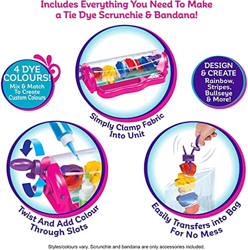 Details: Design & Create super-colourful Tie Dye Fashions! Band it! Twist it! Dye it! Then wear it! Includes everything you need to make a tie dye scrunchie & bandana. Simply clamp your fabric into your unit. Twist and add colour through the slots. Easily transfers into the bag for less messy play! Includes 4 different dye colours to mix & match. Your imagination’s the limit! There's a guide to create different effects: Rainbow Burst, Spiral, Stripes and More! No batteries required. For ages 8 years +.