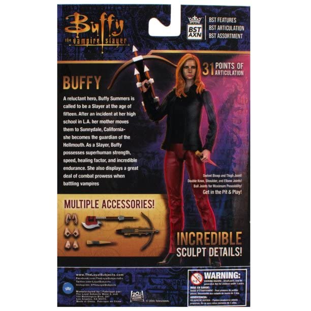 Details: Go back in time and reminisce about the good ol' 90s with this Buffy the Vampire Slayer Retro Action Figure! Featuring the likeness of Sarah Michelle Gellar in a simplified retro format, this Buffy Summers Action Figure is a must-have for all Buffy the Vampire Slayer fans! This Buffy Summers Action Figure has 5 points of articulation, comes with a wooden stake accessory, and features the 1980s style card back design, with a coffin-style blister where the action figure is displayed! Each card back features a memorable look of the character from the classic TV series.
