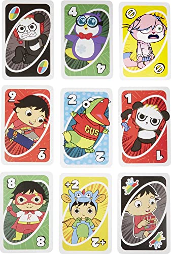 Details: It's the classic card game you know, now featuring young YouTube and TV star, Ryan! UNO Ryan's Mystery Playdate features a colorful deck inspired by the young host of the incredibly popular YouTube channel Ryan ToysReview and TV show Ryan's Mystery Playdate. The special Ryan's Review card allows you take a peek at every other players' cards, and then exchange one of their cards with your own! Just like in classic UNO, match cards by color or number and play action cards like Skip, Reverse and Wild Draw Four to shake up the competition. Score points by being the first to get rid of all the cards in your hand, and when you're down to one card, don't forget to yell, "UNO!" This Ryan's Mystery Playdate version of the family-favorite card game makes a great gift for kids 7 years old and up. Colors and decorations may vary.