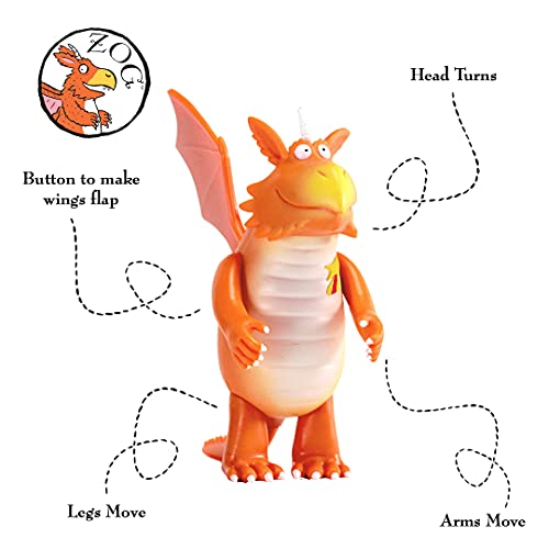 Details: Go on an adventure with ZOG the dragon and let your child play make believe in the wonderful world created by Julia Donaldson. Your child can use thier imagination to teach ZOG how to fly, how to roar, how to blow and breathe fire and how to rescue Princess Pearl! Flapping wings and articulated head, limbs and tail allows you to recreate his poses from the books, TV and DVD movie. He can stand on his feet or your child can make believe he flys as they press the magic button ZOG's back to activate his wings. Measurung 12 cm high ZOG is the perfect size for 3-6 years old boys or girls hands. Includes ZOG with button activated flapping wings, exclusive collectors poster and activity page.